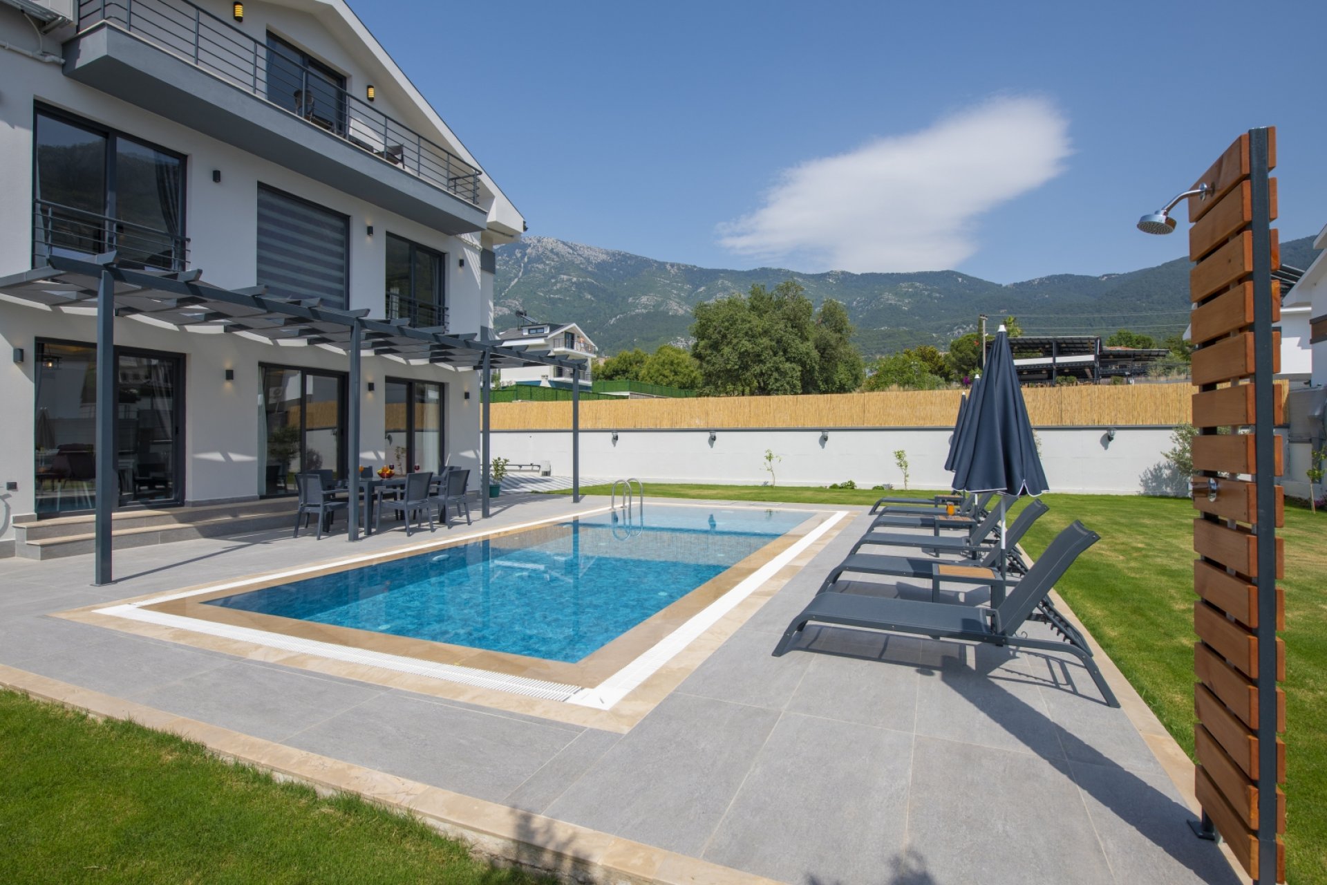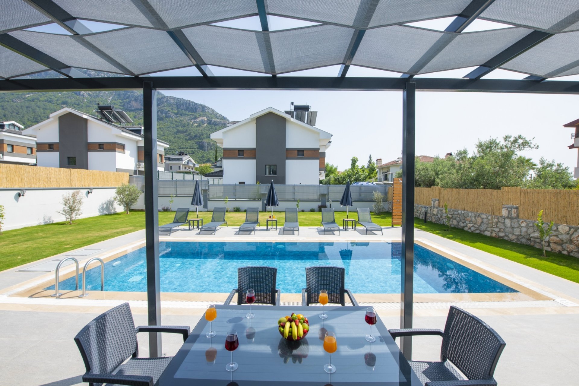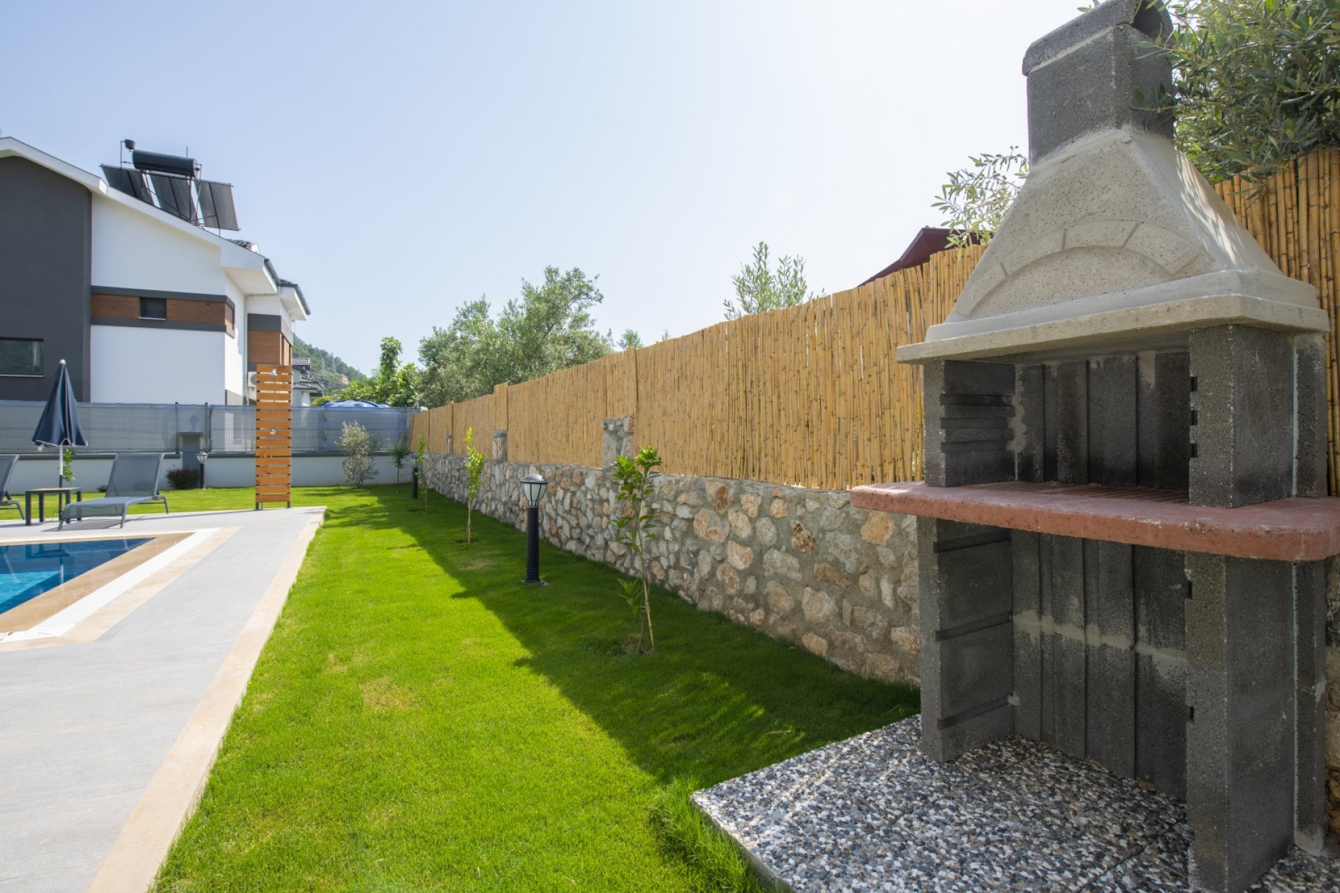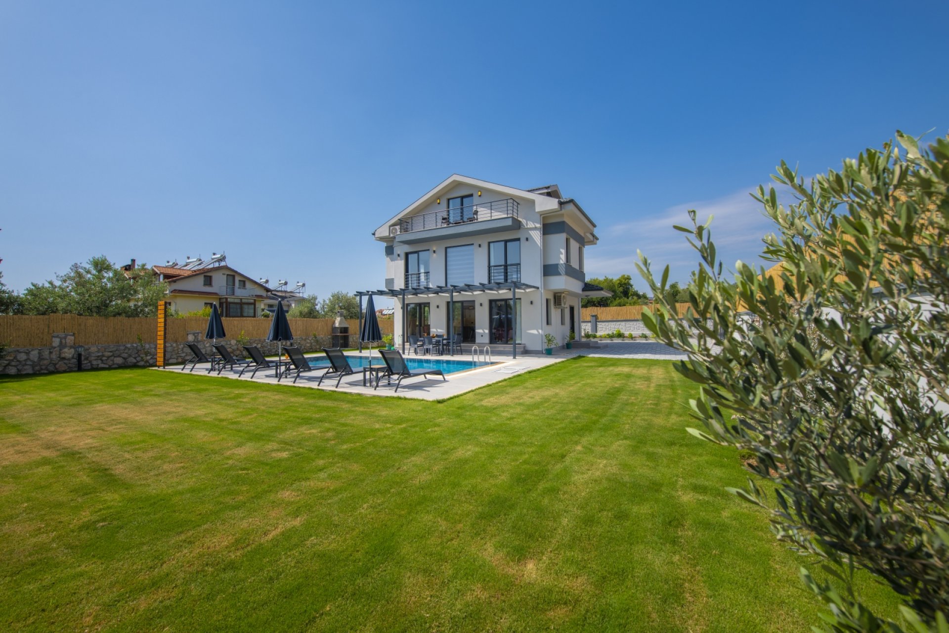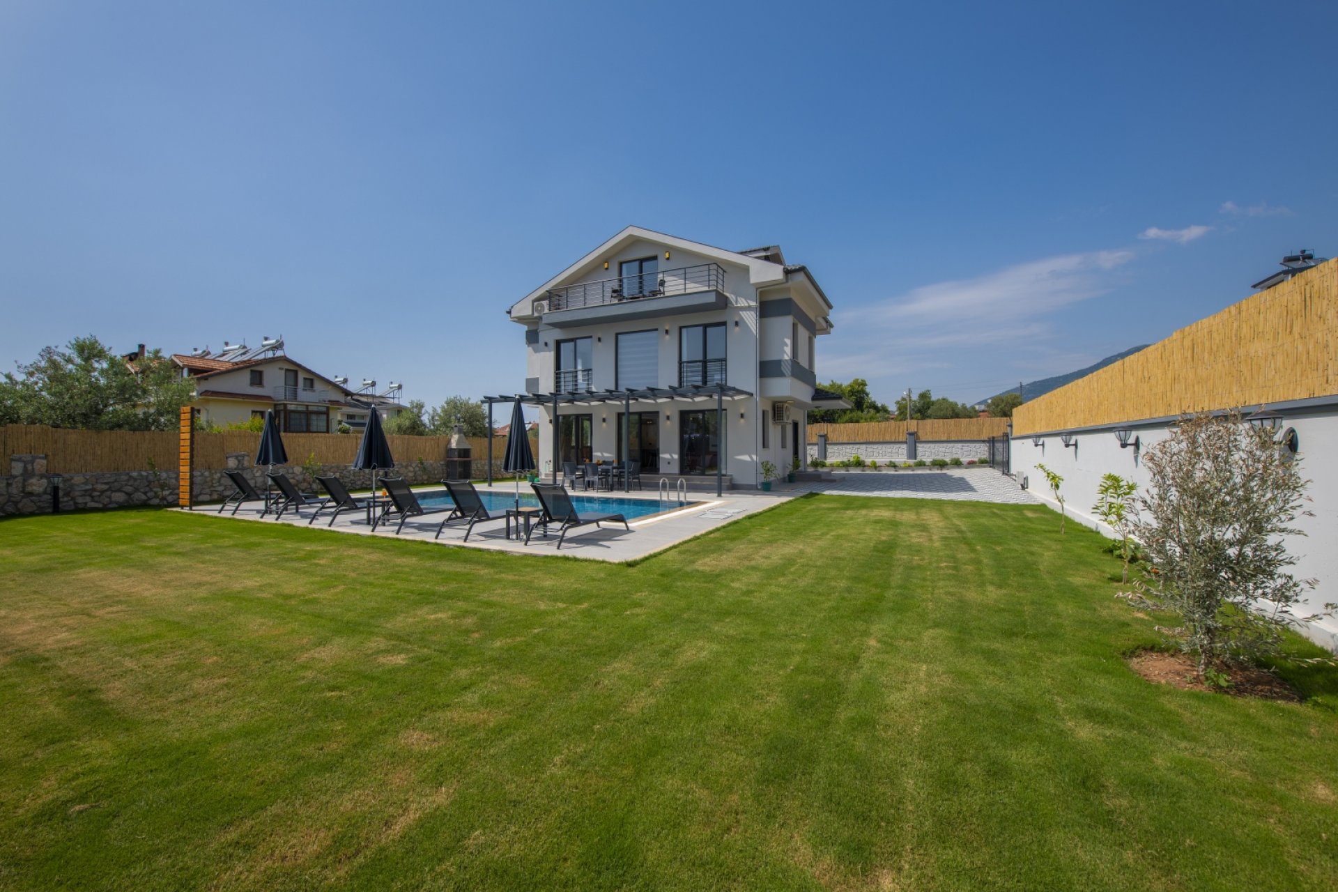 - Bahçe ve Teras: Şezlong, şemsiye, bahçe mobilyaları, güneşlenme terası ve araç park alanı.