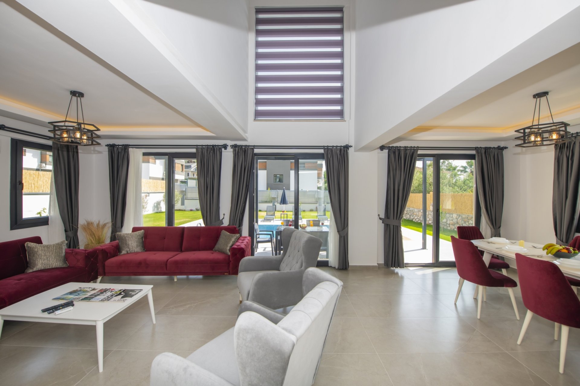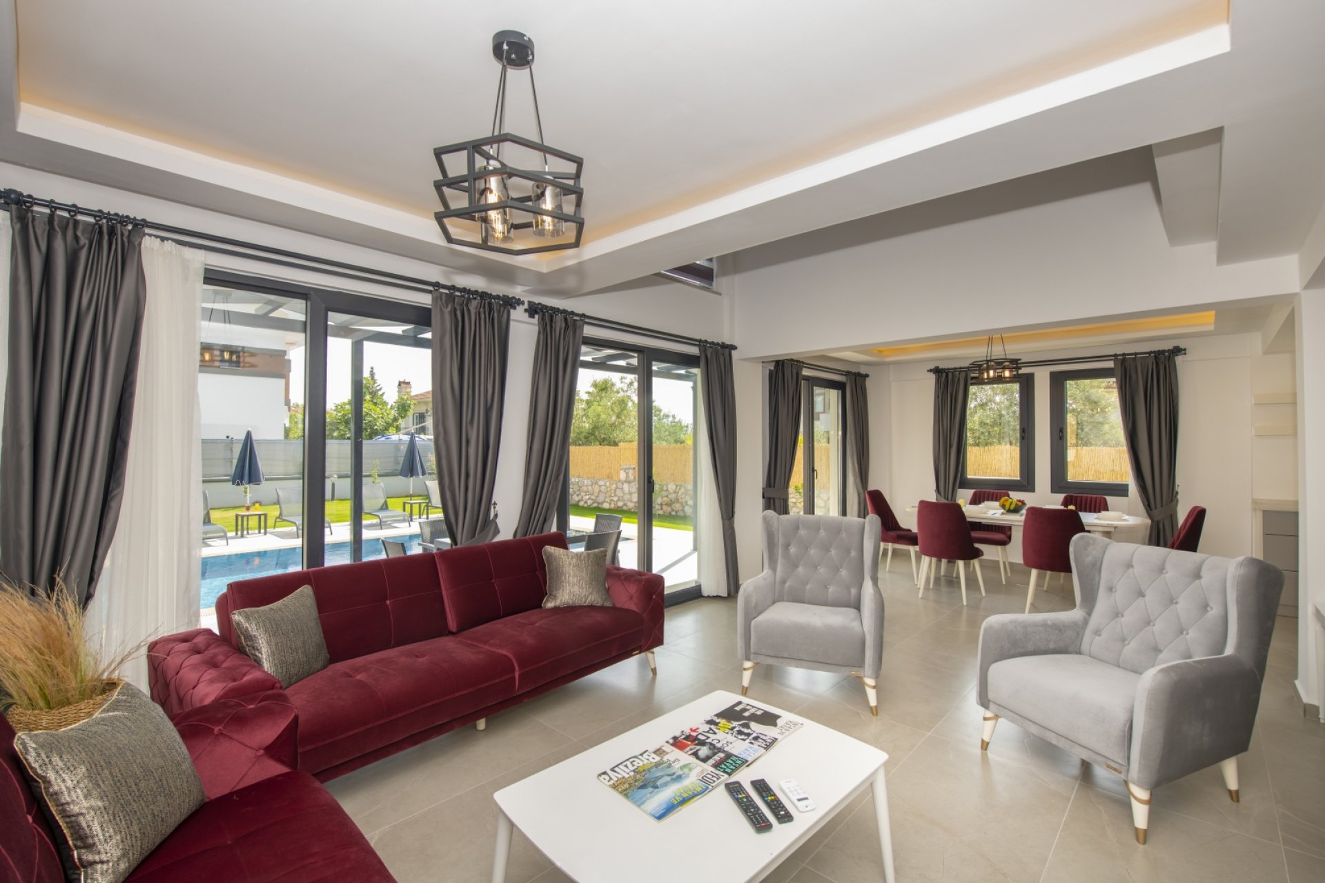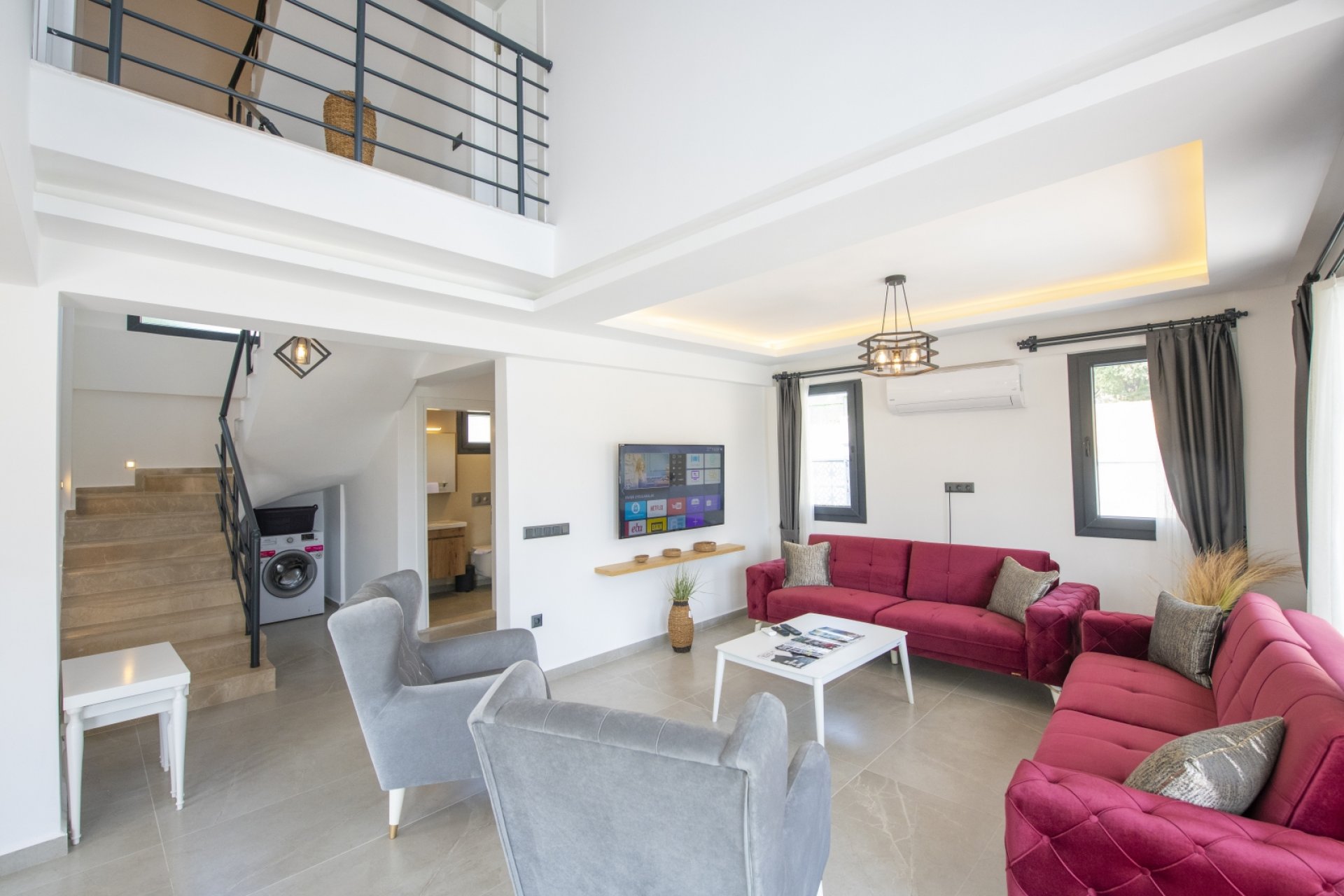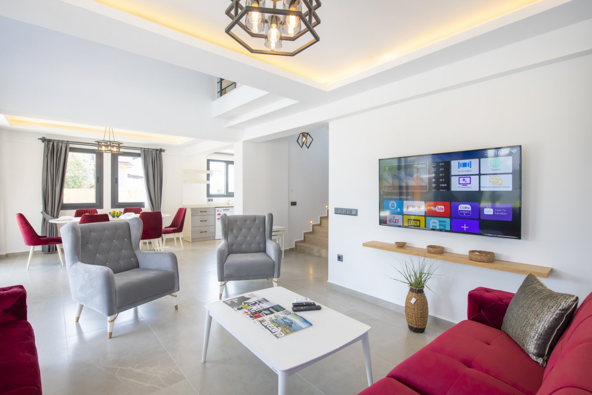 - Salon: Modern açık mutfak-salon, klima, rahat koltuklar, 6 kişilik yemek masası, Smart LED TV, uydu alıcısı ve mama sandalyesi.