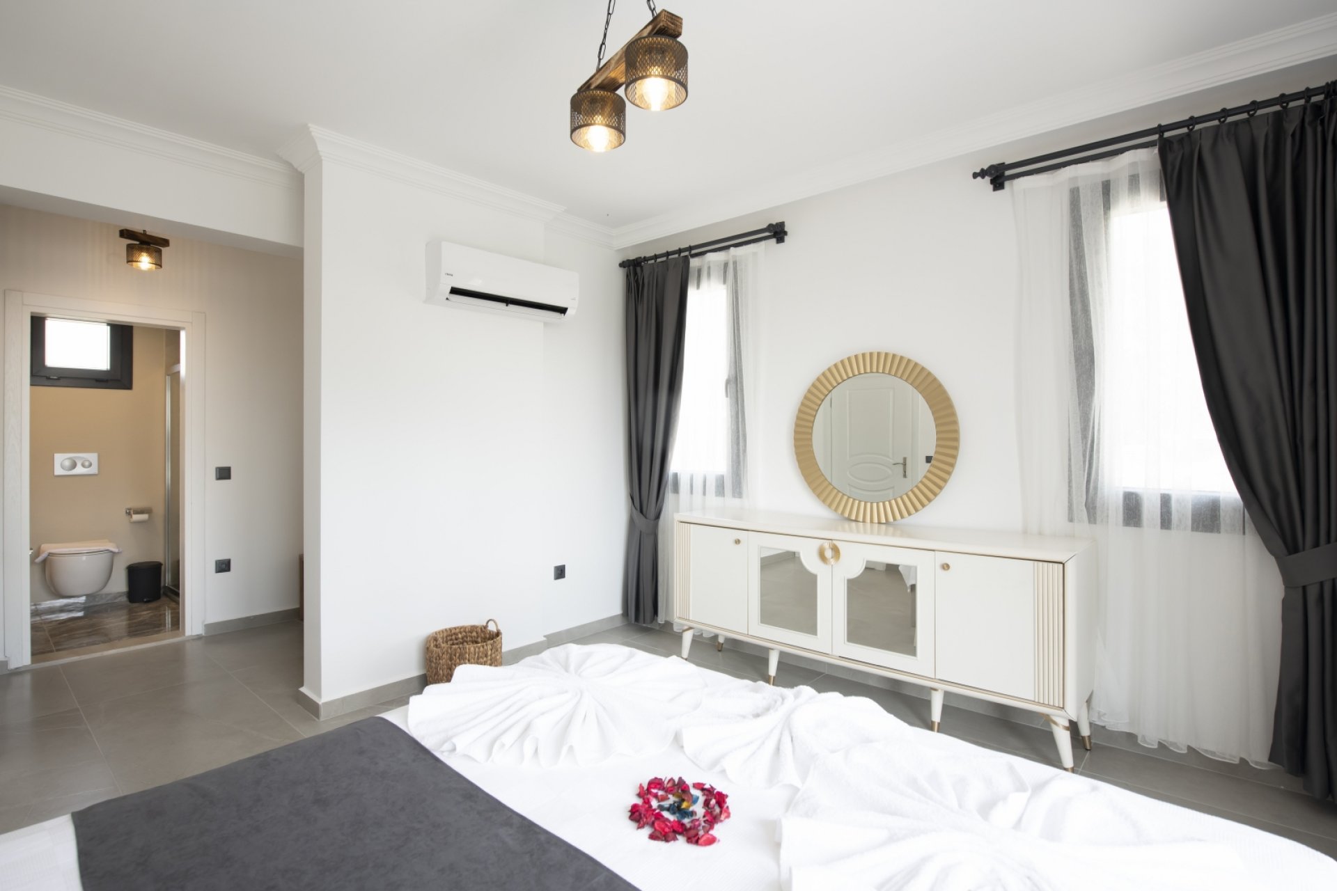 - Yatak Odası 1: Çift kişilik yatak, ebeveyn banyosu, klima, bebek yatağı, elbise dolabı.