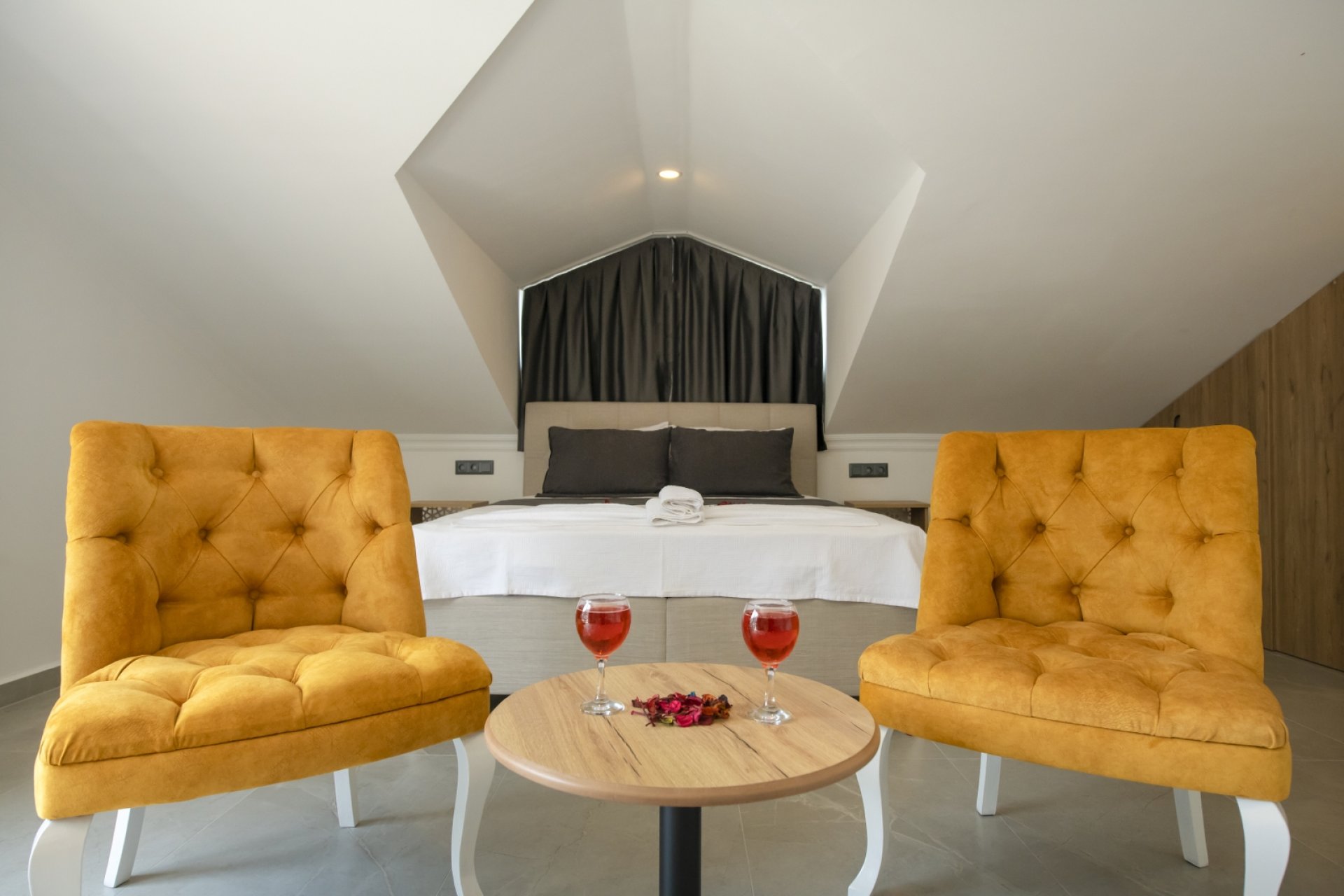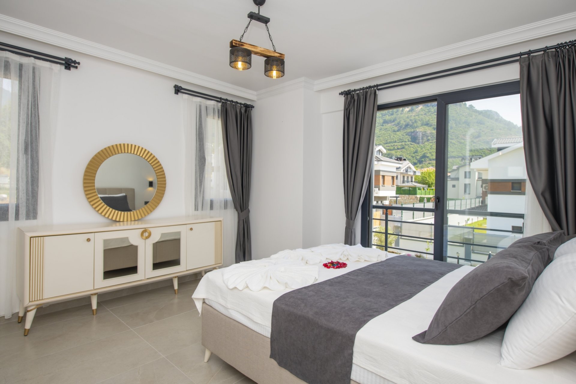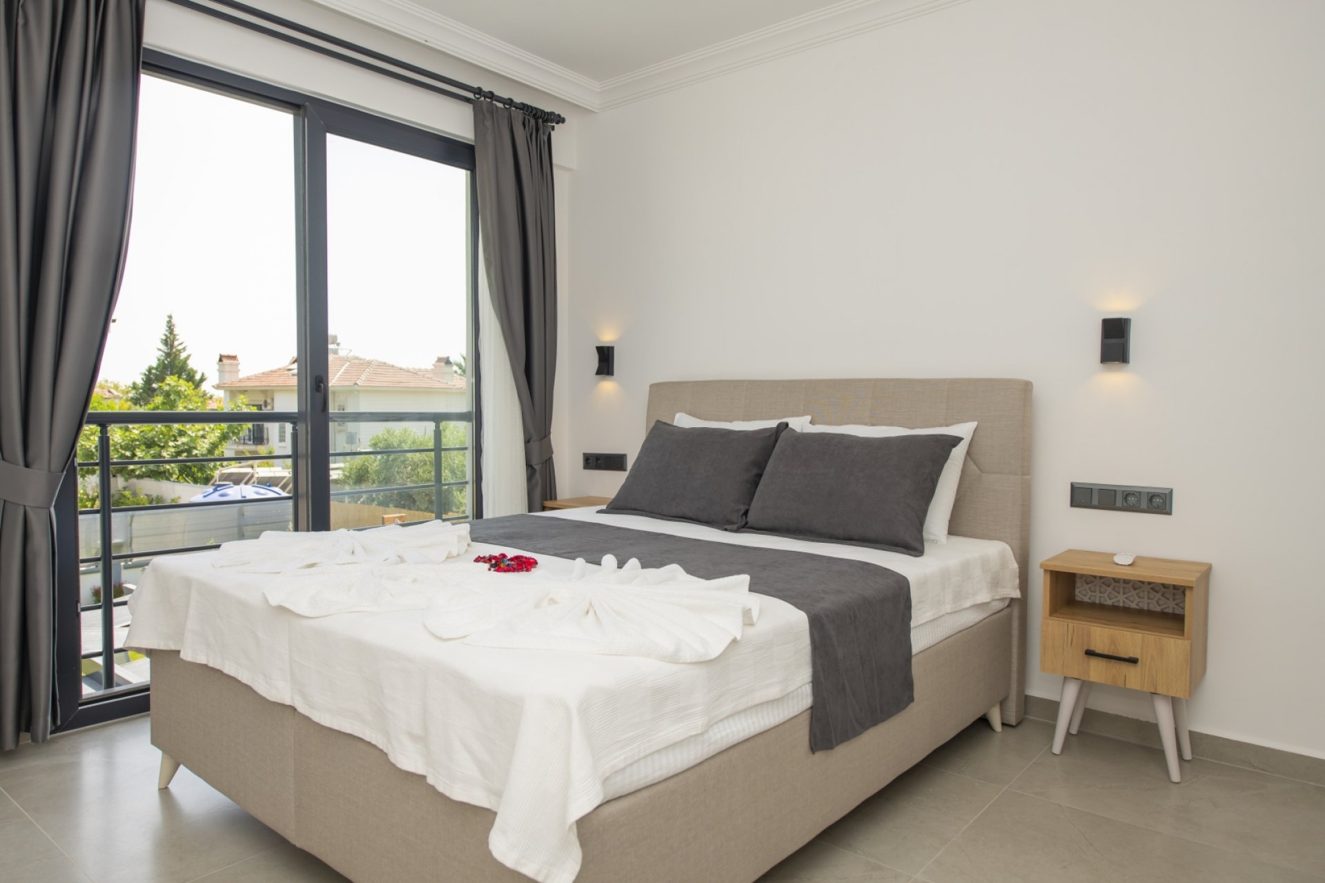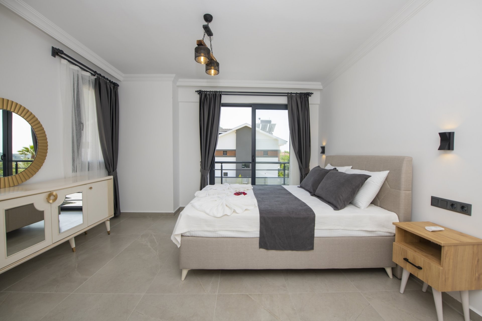 - Yatak Odası 3: Çift kişilik yatak, ebeveyn banyosu, jakuzi, Smart TV, mini buzdolabı, kettle, klima, elbise dolabı ve balkon.