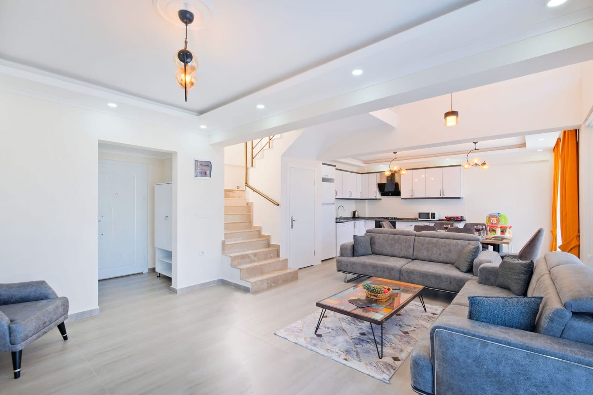 Villa Simge 1, üç kat boyunca yayılan modern ve fonksiyonel bir yapıya sahiptir: