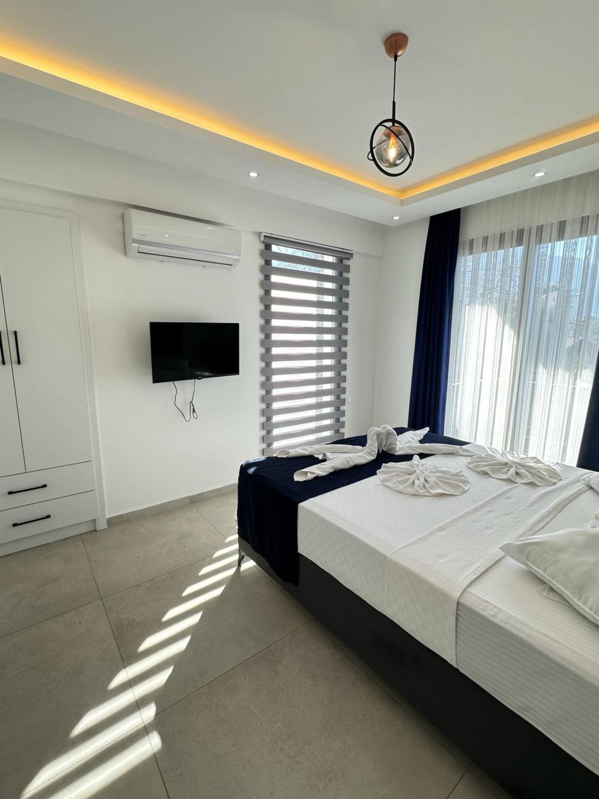 - 2. Yatak Odası: Çift kişilik yatak, elbise dolabı, komodin, klima, banyo ve WC.