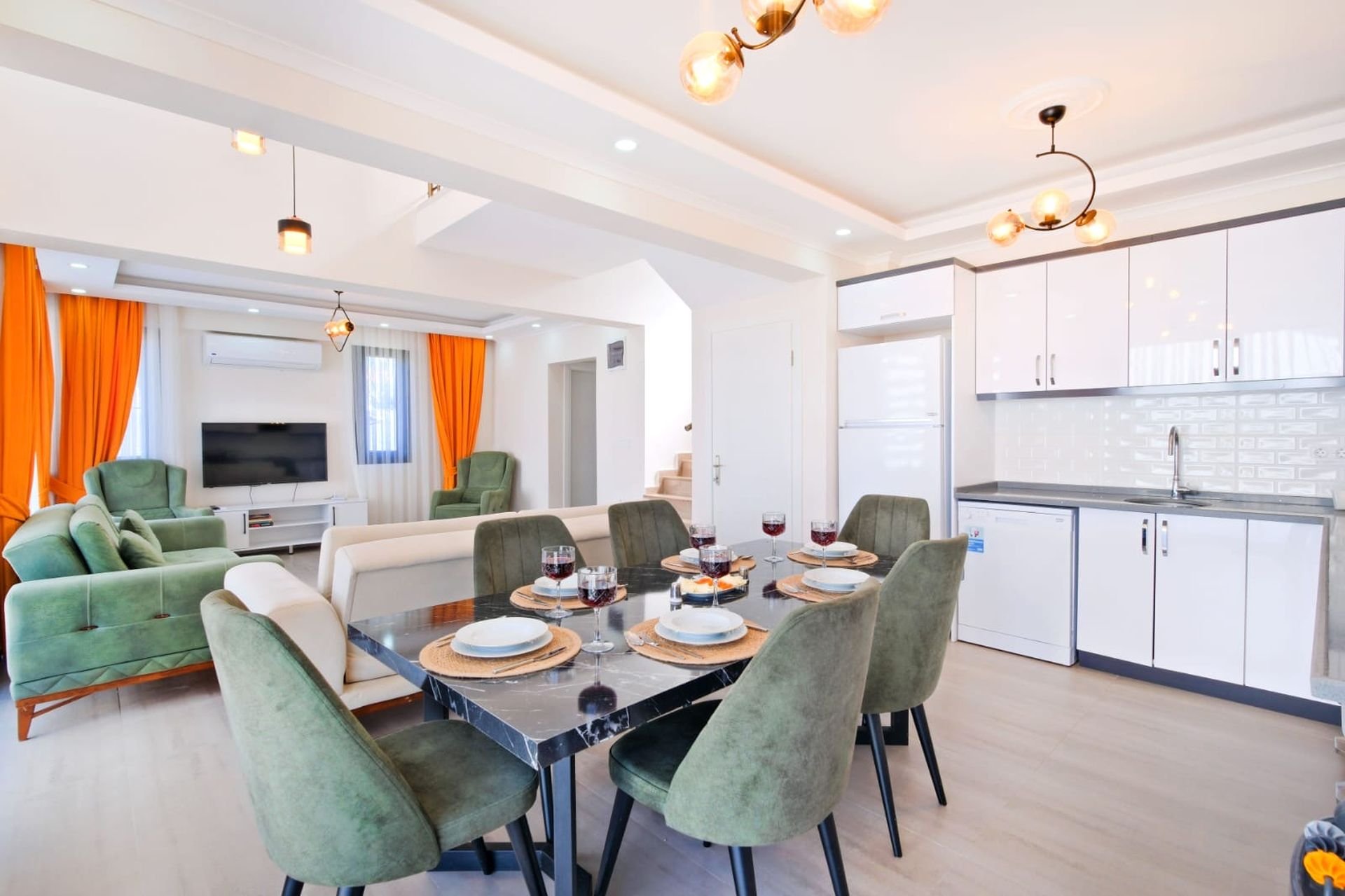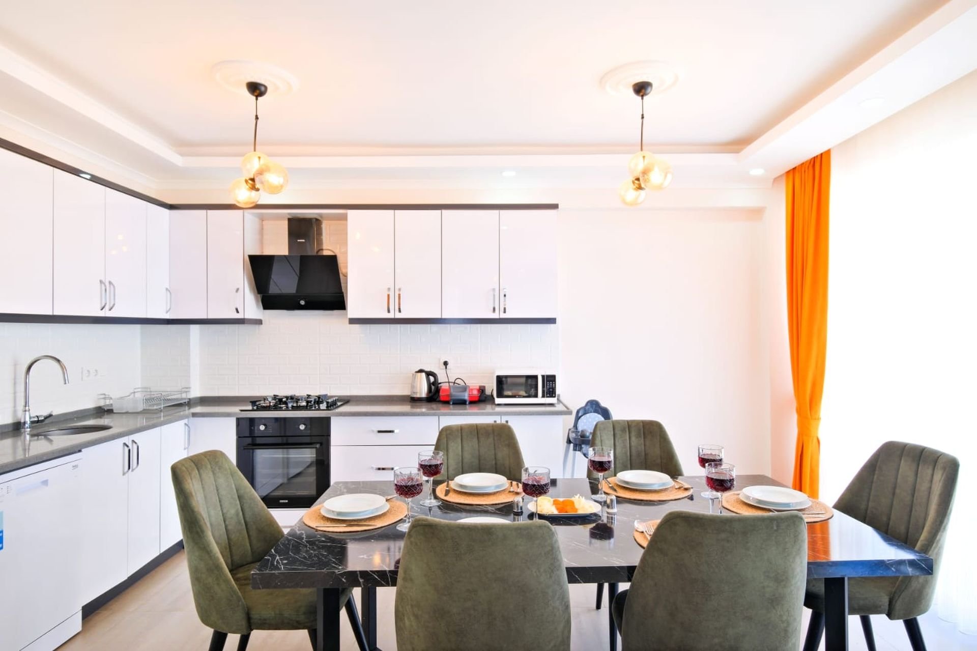 Mutfak: Modern Amerikan mutfak; bulaşık makinesi, buzdolabı, 4’lü ankastre ocak, fırın, yemek masası, elektrikli su ısıtıcısı ve 6 kişilik yemek takımı/mutfak araç gereçleri.