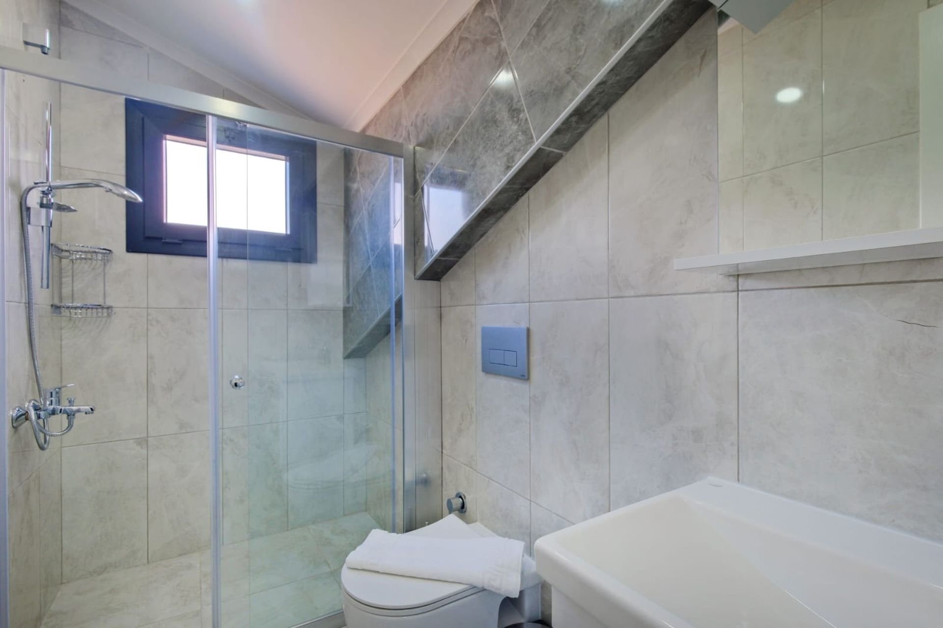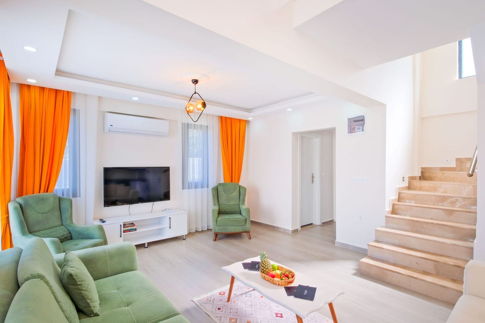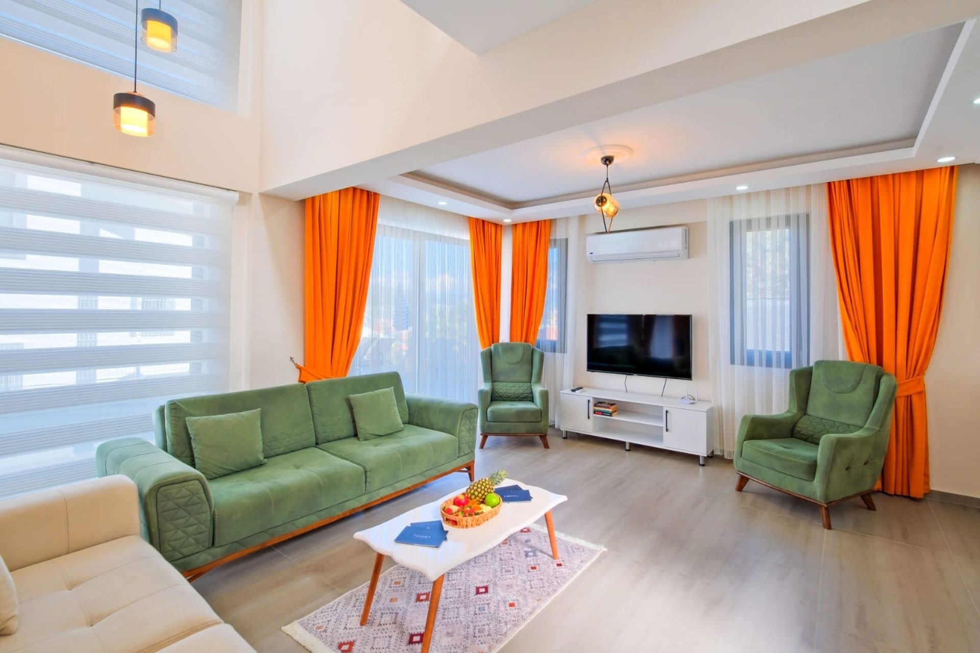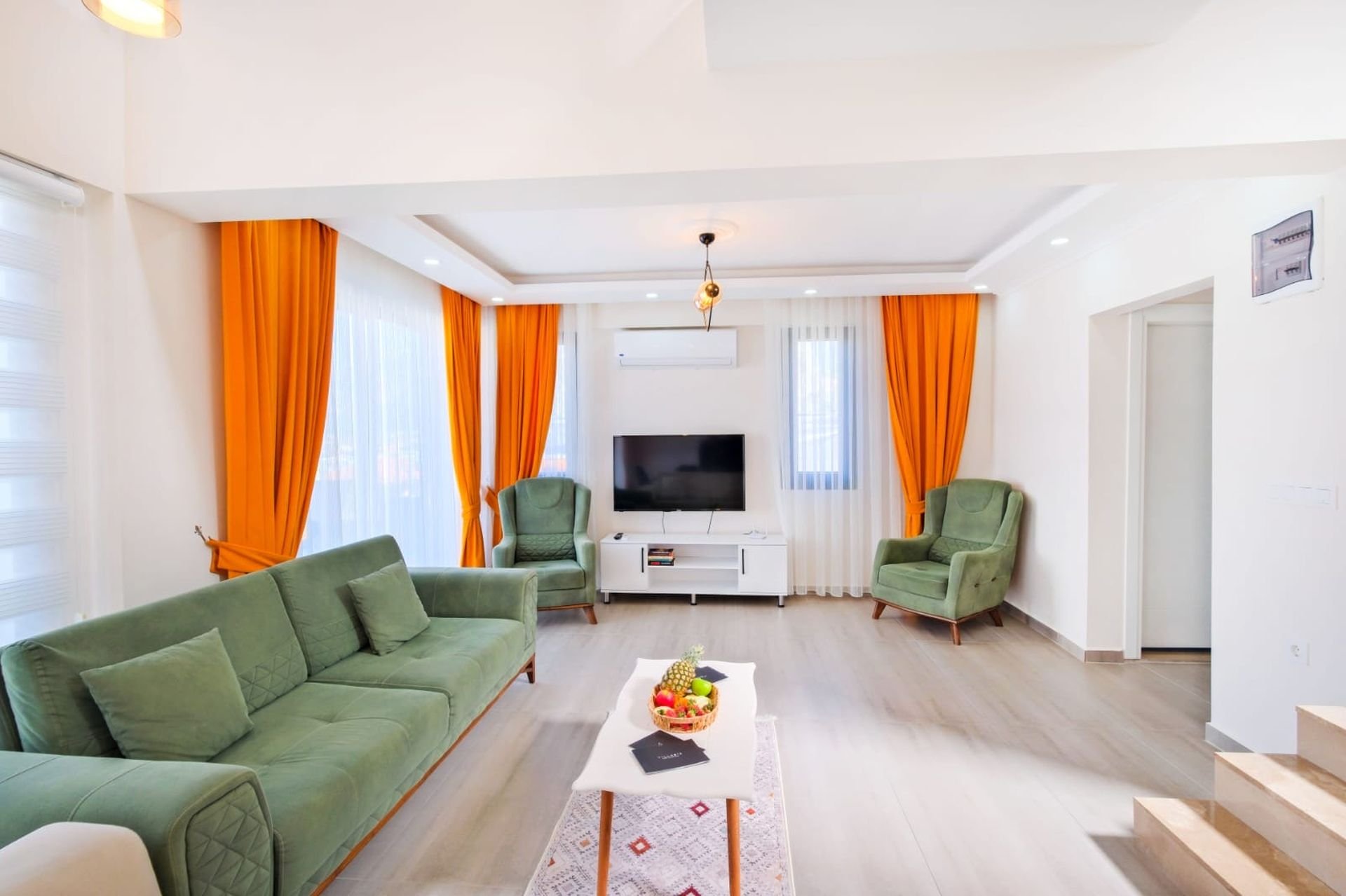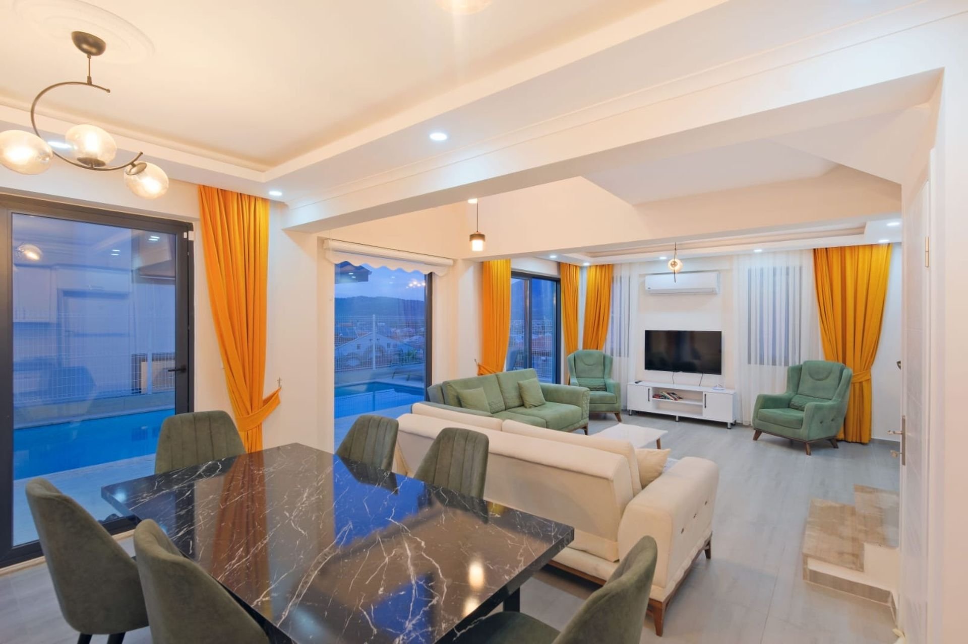 Salon: Klima, oturma grubu, TV, orta sehpa ve ortak kullanım WC-lavabo. Salondan doğrudan havuz terasına çıkış mevcuttur.