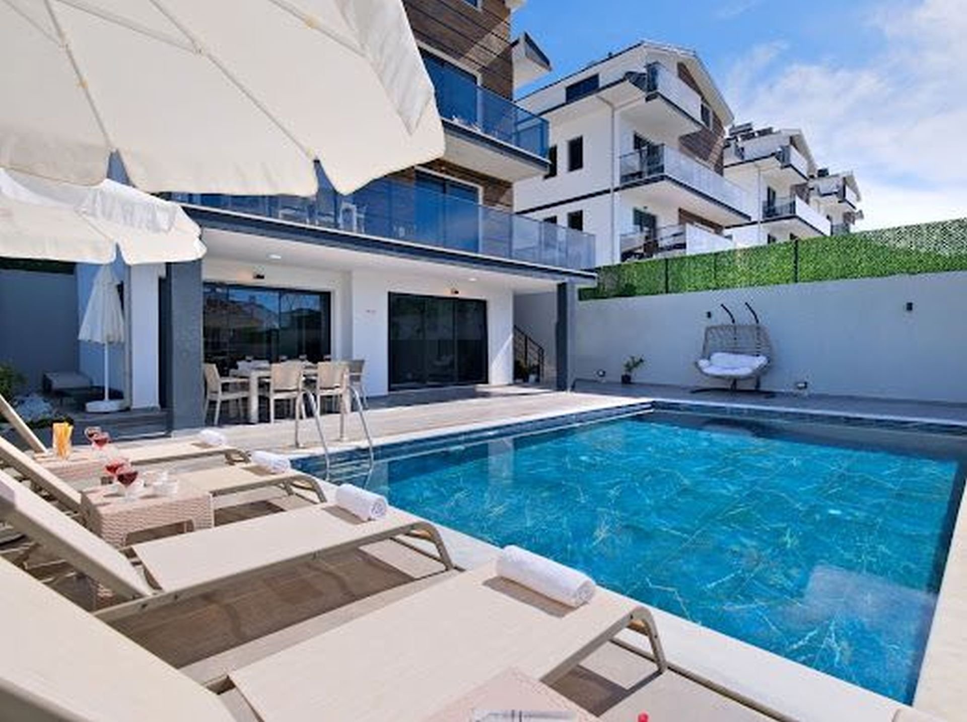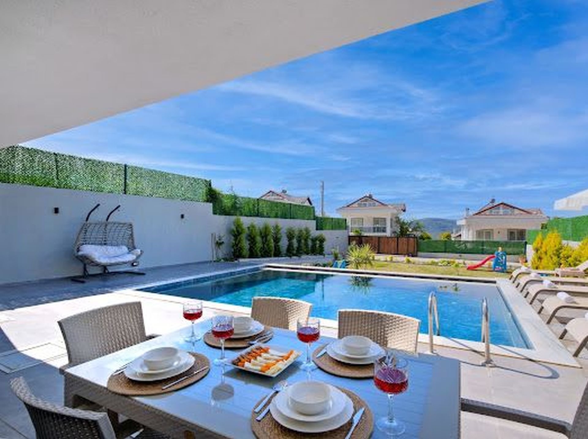 Villa Şimşek, Fethiye\'nin Ovacık bölgesinde yer alan özel havuzlu bir tatil villasıdır. Modern iç ve dış mimarisiyle öne çıkan villamız, eğlence merkezlerine, restoranlara ve marketlere yakın konumda yer almaktadır. Kalabalık gruplar ve çocuklu aileler için ideal bir seçenek olan Villa Şimşek, keyifli vakit geçirmeniz için tüm olanakları sunmaktadır.